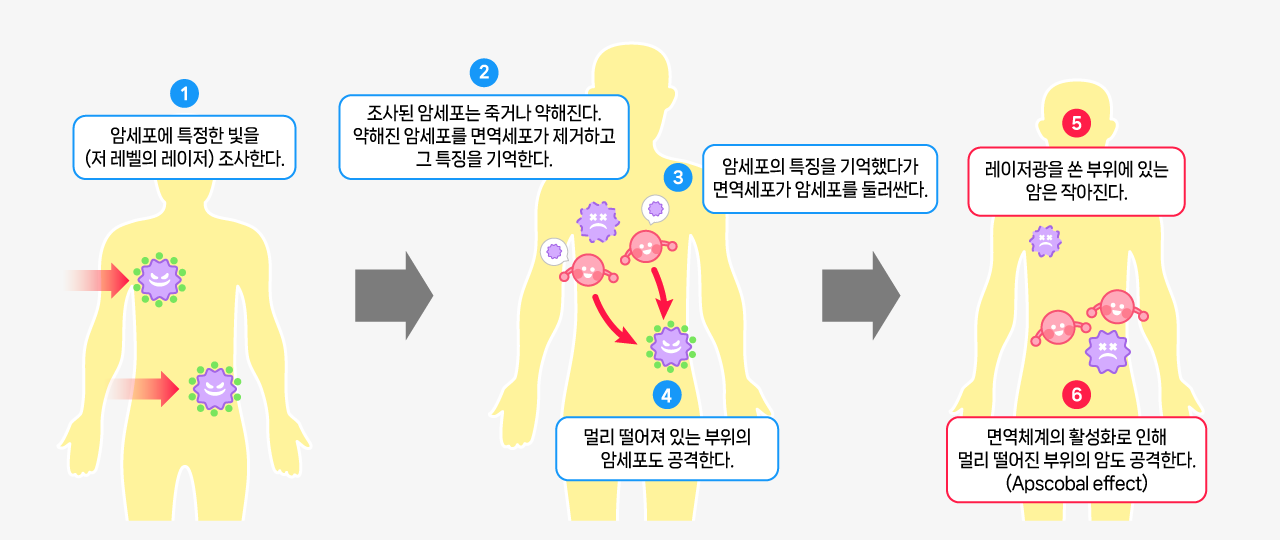 체내 여러 곳에 생긴 암 조직의 근접시켜 레이저 빛이나 초음파를 쬐어 종양을 파괴하고, 그 후 주위에 흩어진 암세포를 면역세포에 의해 제거시키는 두 가지 작용을 갖는 치료법입니다.