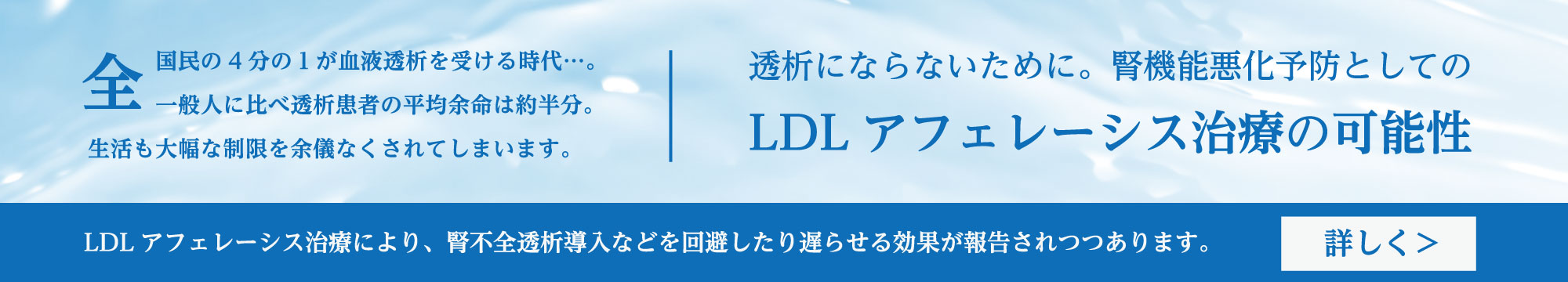 本治療は、家族性高コレステロール血症、薬物治療に反応しない閉塞性動脈硬化症、薬物治療に反応しないネフローゼ症候群のなかでも巣状糸球体硬化症において保険適応による治療が行われておりますが、本治療は承認医療機器の承認目的外使用となります。日本国内では、未承認医療機器を、医師の責任において使用することができます。