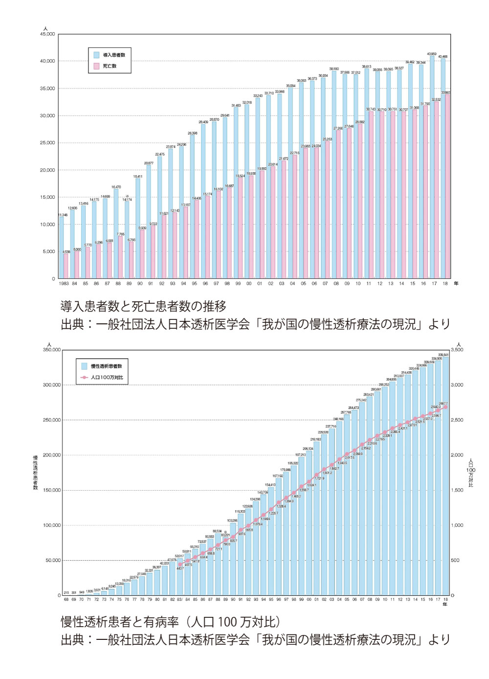 現在、わが国では高血圧の患者さんが約1000万人、糖尿病の患者さんが約950万人いるといわれており、生活習慣の改善や継続的な投薬治療を受けています。この中には、腎臓の機能障害を合併することがあり、この場合多くが血液透析を受けることになります。この数は、30万人以上にものぼり全国民の400分の1が透析加療を受けていることになります。