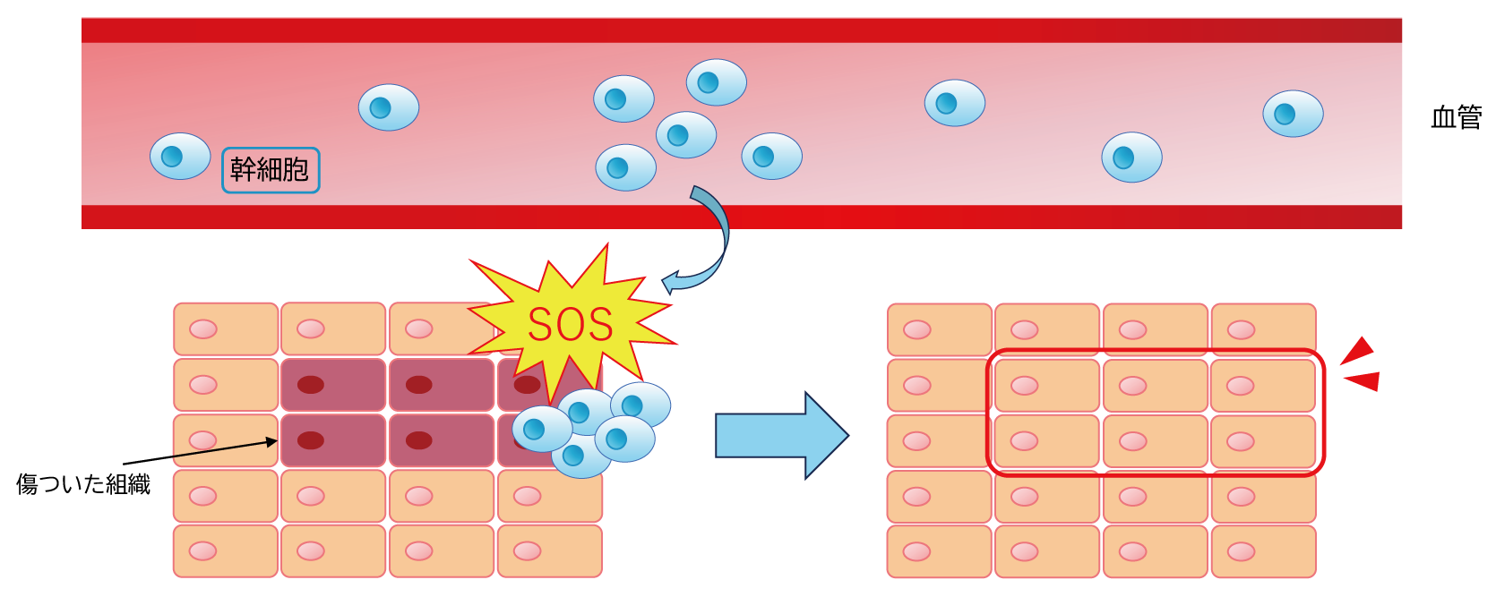 体内で傷ついた組織はSOSサインのような信号を出して、幹細胞を呼び寄せることができます。このように幹細胞が損傷した部位に集まる仕組みをホーミング効果といいます。 この治療は、患者様の組織から幹細胞を取り出し、体外でそれを増殖させ、ご自身の体に戻す治療となります。体内に戻った幹細胞は、SOS信号を聞きつけて強力な応援部隊として損傷組織に集まり、回復させようと奮闘します。これがホーミング効果を利用した幹細胞治療の仕組みです。