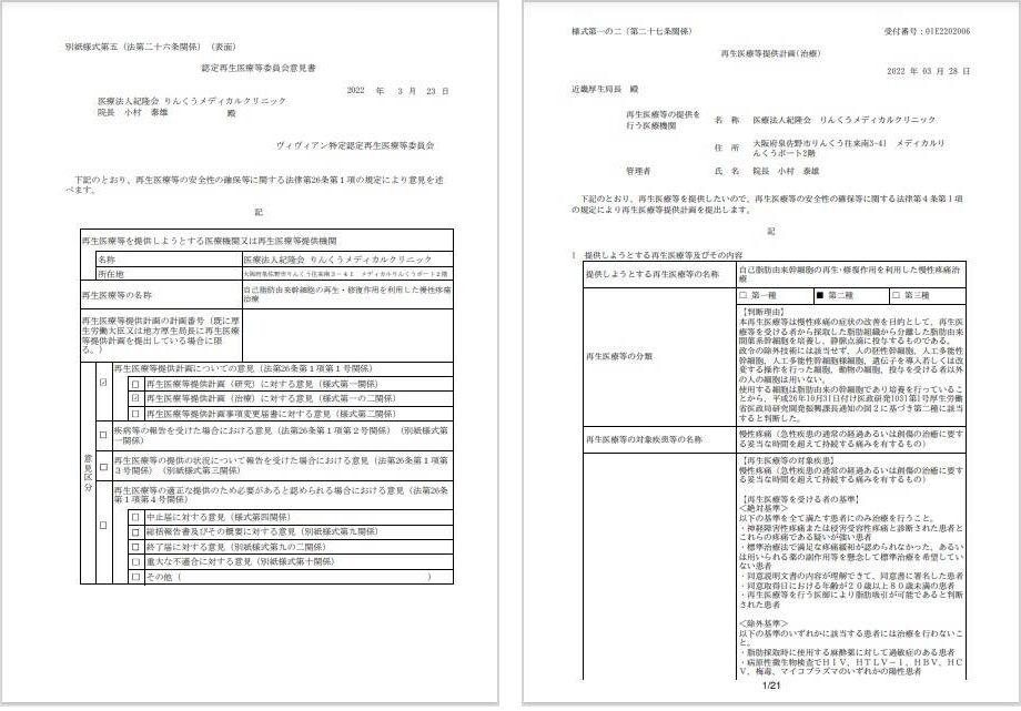 (第二種再生医療等提供計画番号:PB5220009、 適応疾患:慢性疼痛)