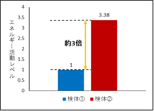 検体①:解凍直後の凍結保管した細胞、検体②:凍結保管した細胞を再度培養した細胞。検体②の方が細胞のエネルギー活動が活発であることを示している。