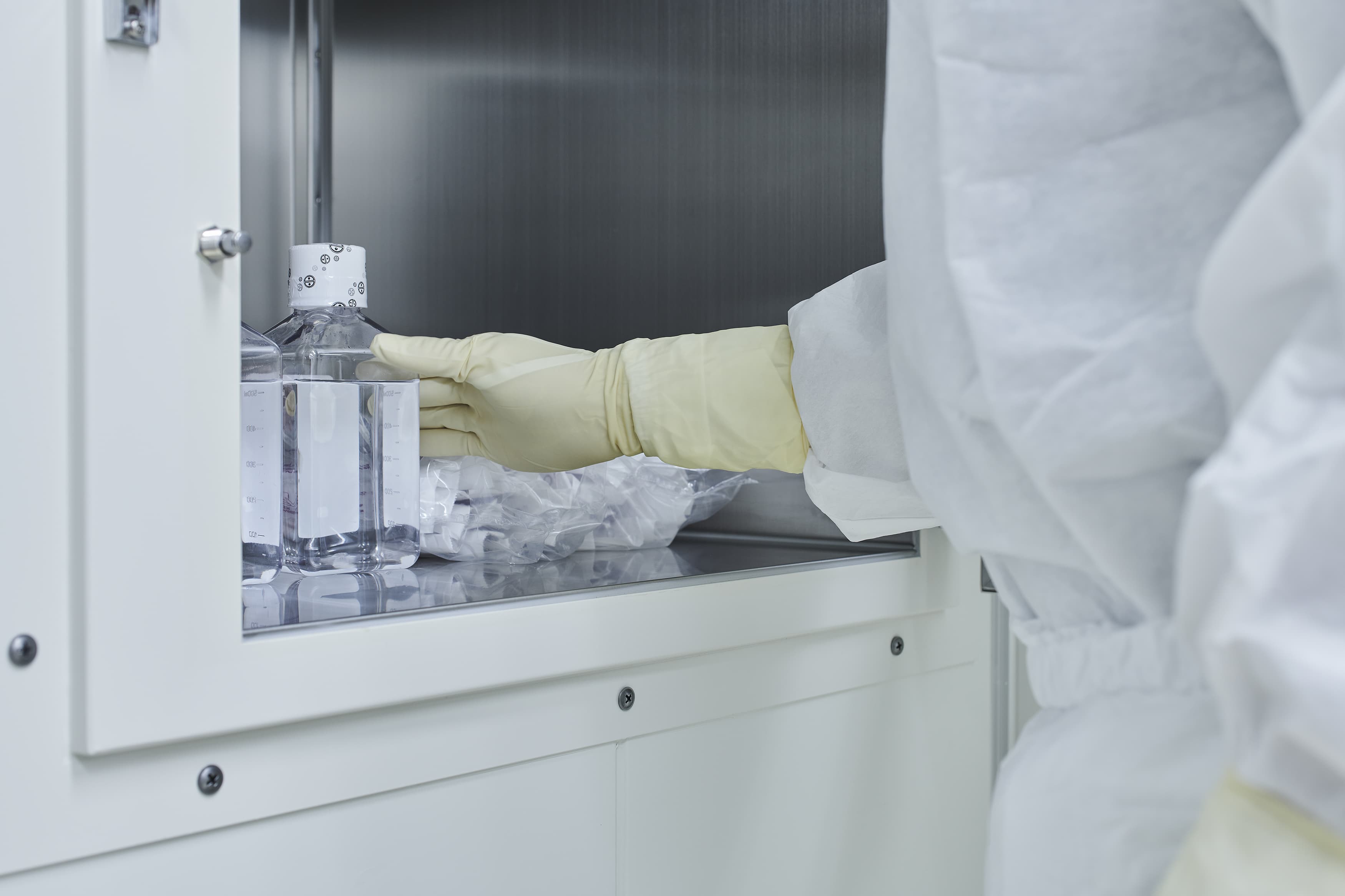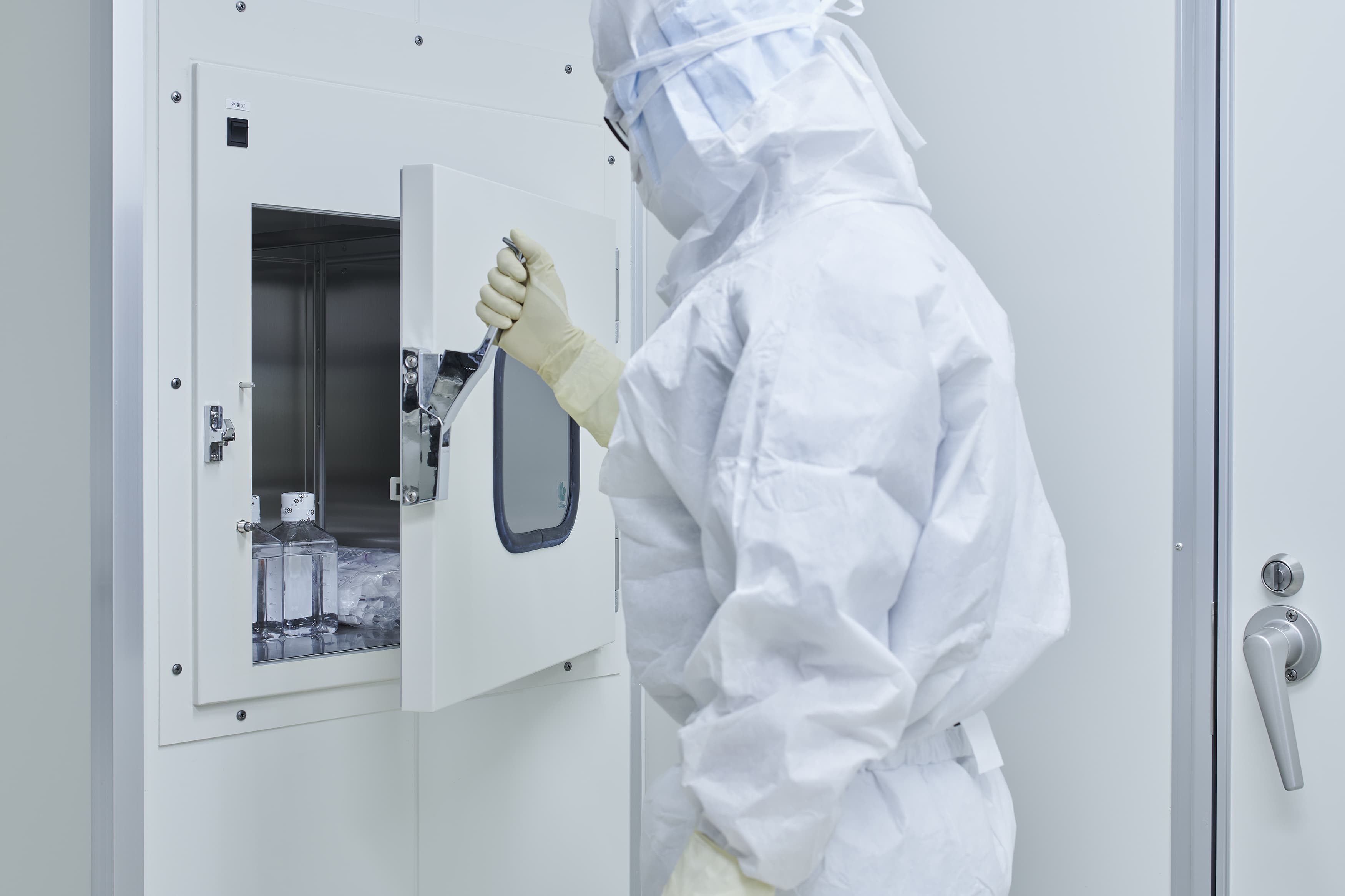 ①脂肪組織は同じフロアにある培養施設にすぐに移送されます。培養に使用する資材や検体は、入念に滅菌しながら、専用の道(パスボックス)を通って、培養室まで運ばれます。