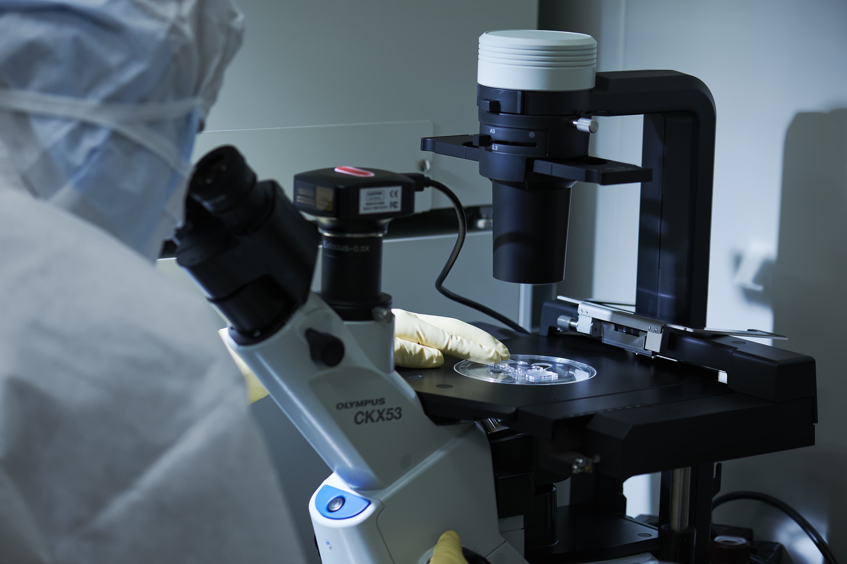 ②操作は安全キャビネットと呼ばれる最も空気のきれいな無菌エリアで行います。そこで、専属の培養士が異物混入の無いよう、慎重に培養の操作を行います。患者様に安心できるものを提供するため、培養士は専門の研修を受けています。