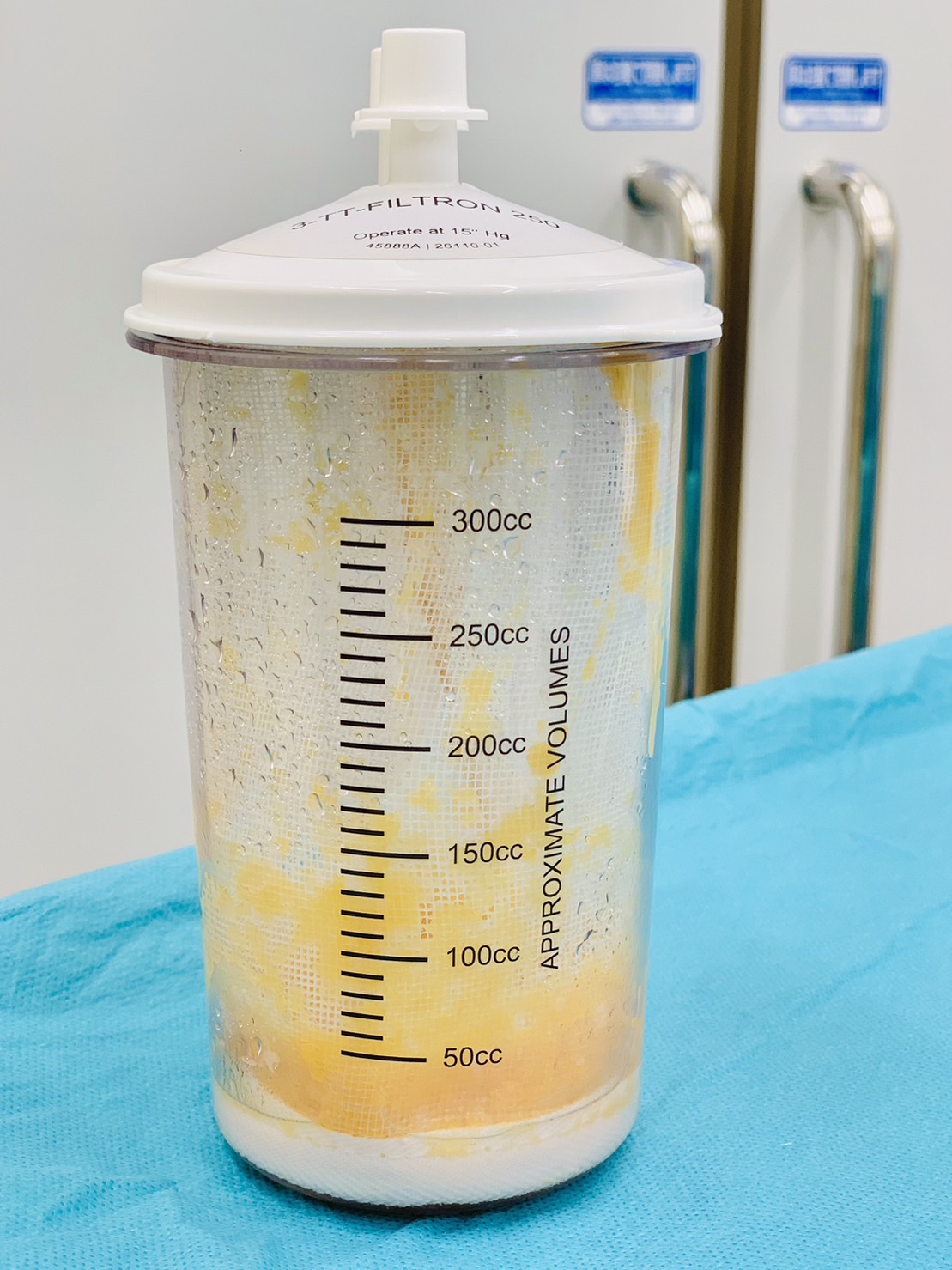LIPOLIFE で採取した脂肪は血液の混入が少なく、黄色く見えます。